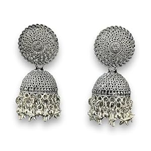 Stylish Oxidized Star Drop Silver Jhumka Earrings with Turquoise Beads & Dangles for Women