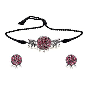 Yellow Chimes Traditional Silver Oxidised Jewellery Set Silver Choker Set | Threaded Peacock Shaped Stone Choker Necklace Set | Birthday Gift For Girls and Women Anniversary Gift for Wife