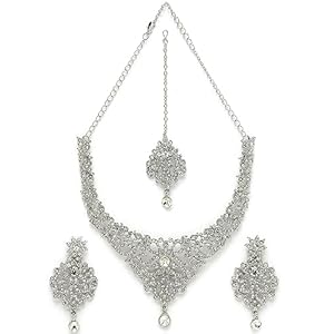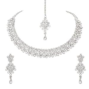 Sukkhi Luminous Rhodium Plated Silver AD White Stone Collar Bone Necklace Set With Earring And Maangtika | Jewellery Set For Women (NS105667)