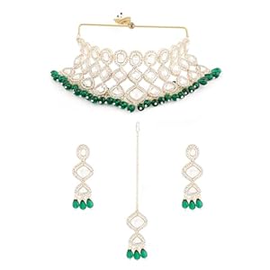 ZAVERI PEARLS Green Bead Austrian Diamonds Bridal Choker Necklace Earring Maangtikka Set For Women-ZPFK17312