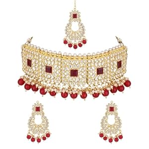 Fashion Women Red Pearl Gold-Plated Stone Jewellery Set, Maang tikka with A Pair of Earrings for Mehndi, Haldi, Wedding, Godbharai, Bridal-Red White Colour