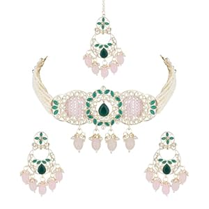 I Jewels Gold Plated Pearl Polki Kundan Choker Necklace Jewellery Set With Earrings & Maang Tikka for Women (ML331GPi)