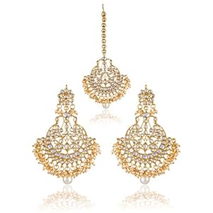Chooseberry The Royal Bride Collection Gold Plated Chandbali Kundan Bridal Earrings and Maangtikka with Hanging Pearls for Women and Girls