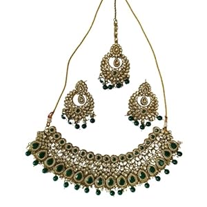 ZAVERI PEARLS Green Bead Drops Crescent Shape Kundan Earring & Maangtikka Set -ZPFK11542