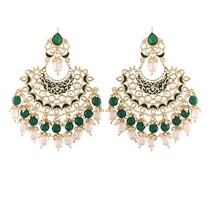 Vanee Traditional Gold Plated Alloy Green Beads and White Kundan Chandbali Earring for Women