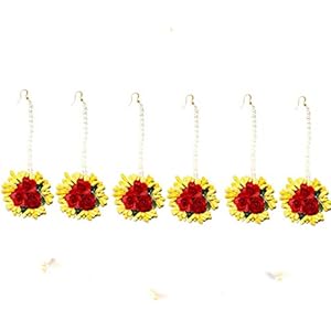 URBAN SIGMA Flower Maang tikka Jewellery Set for Wedding | Baby shower | Haldi | Mehandi | Party in Red and Yellow colour for Girls and Women(Combo of 6)