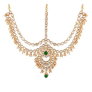 Peora Gold Plated Indian Traditional Wedding Kundan Green Pearl Maang Tikka for Women Girls
