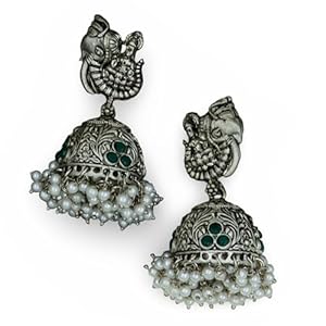 JWELLA Antique Silver Engraved Jhumka Earrings with Green Stone Accents