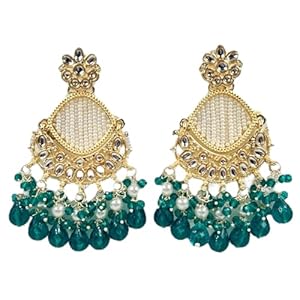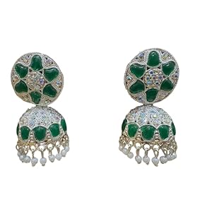 Women’s Sparkling Green Silver Polished Jhumka Traditional Kundan Chandbali Earrings Classic Earrings Indian Jhumka Studded Drop Earrings for Women 1 Pair