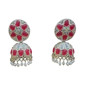 Women’s Sparkling Pink Silver Polished Jhumka Traditional Kundan Chandbali Earrings Indian Jhumka Studded Drop Earrings for Women Classic Earrings 1 Pair