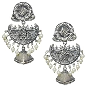 Redsify Silver Oxidised Plating Tribal Flower Dangle Earrings with White Pearl Beads for Women and Girls | 1 pair