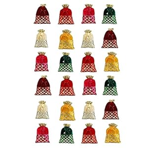 KRIWIN Pack of 25 pcs Women’s Silk Drawstring Closure Small Size Gift Potli Bags Pouches(17.78 X 12.5 cm; Red & Golden)