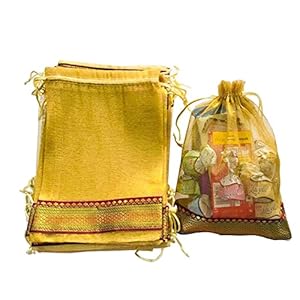 KRIWIN Pack of 25, 9 X 7 inch Medium Size Tissue Silk Gift Bags/Potli/Pouches with Brocade Border (Golden)