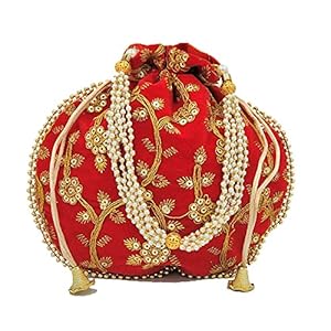 FILORA Women’s Ethnic Rajasthani Silk Potli Bag Potli Purse Bridal Purse (Combo of 2 Potlis Red and Green)