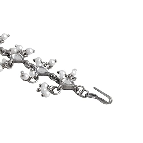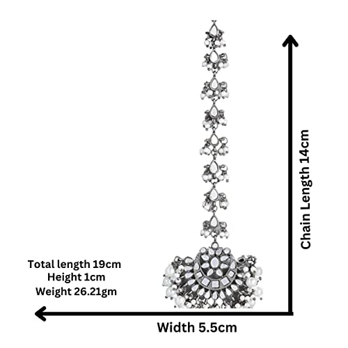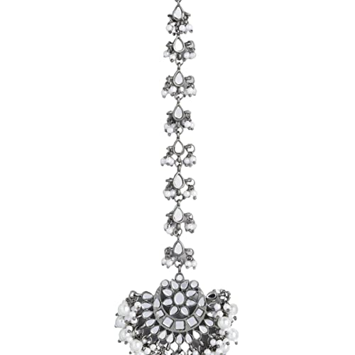 Accessher Silver Plated Traditional Handcut Mirrors and Pearls Embellished Statement Design Oxidized Maang Tikka/Maang Tika for Women and Girls Pack of 1