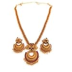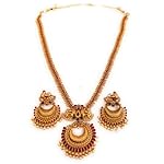 Traditional Laxmi & peacock pendant with Ruby & Emerald beaded maharani South Indian wedding jewellery Necklace with Earrings. It has Unique and Antique design. Traditional Festive Bridal Wear Jewellery Set for Women Gold plated artificial temple jewellery. Wedding Jewellery Haram of Adyashree latest temple wedding jewellery fashion for Women is a perfect fit for weddings and grand occassion. Adyashree Gold Plated matte finish ethnic Necklace Set For Women is Made Of Alloy. Womens love for traditional jewellery and their uniqueness in looking gorgeous wearing traditional fashion jewellery for different wedding and festive occasions like Dasara jewellery and Diwali special occasion jewellery make them look more younger and beautiful. These traditional antique are suitable for all occasions right from various ceremonies to weddings. It makes a perfect match for jewellery for festive and wedding season. This antique traditional fashion jewellery has uniqueness with matte finish.