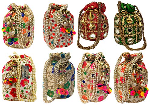 This Product feature is -Bags Type – Potli Bag, Color – Multicolor, Closure – Drawstring, Pockets – 1, Number of Compartments – 1, Fabric – Silk, Work – Embroidery, Type -Potli, Size/ Volume – Medium. It’s come. It comes in sets and combo of 8