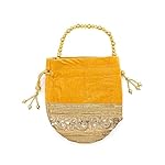 Designer Velvet Potli Bag For Women With Golden Embroidery & Pearl Handle Tassel Matka Style Traditional Hand Bag (Yellow)
