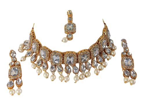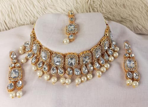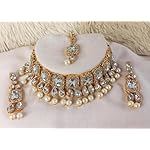 Fashion Women WhitePearl Gold-Plated Stone Jewellery Set, Maang tikka with A Pair of Earrings for Mehndi, Haldi, Wedding, Godbharai, Bridal-White Colour