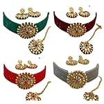 Gold Plated Pearl Beaded Adjustable Choker Necklace with Earring Maang Tikka Jewellery Set