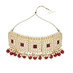 This exquisite traditional Pearl Kundan studded choker necklace set by I Jewels is the perfect addition to your jewelry collection. Plated in 18k gold, the set features a stunning choker necklace, matching earrings, and a maang tikka, all adorned with intricate Pearl and Kundan work. The timeless design and attention to detail make this set a must-have for any formal event or occasion. The high-quality materials and expert craftsmanship ensure that this set will last for years to come, making it a great investment for any jewelry collection. Whether you’re a bride-to-be or simply looking to add some glamour to your wardrobe, this necklace set is sure to turn heads. Give yourself or a loved one the gift of timeless beauty with this exquisite jewelry set.
