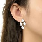 The set includes a layered pearl necklace and a pair of matching earrings, all plated in gold for a luxurious look. The necklace features a layered design with a combination of white pearls and white stones studded in the center, creating a stunning contrast. The pearls are strung together on a gold-plated chain, providing a classic and timeless look. The earrings are also studded with white stones, complementing the necklace perfectly.