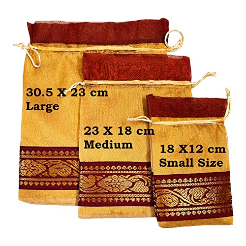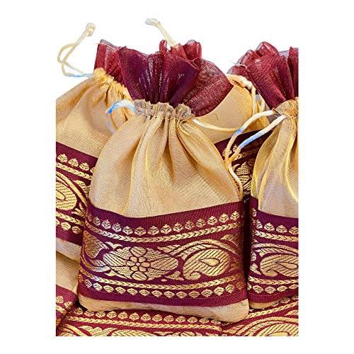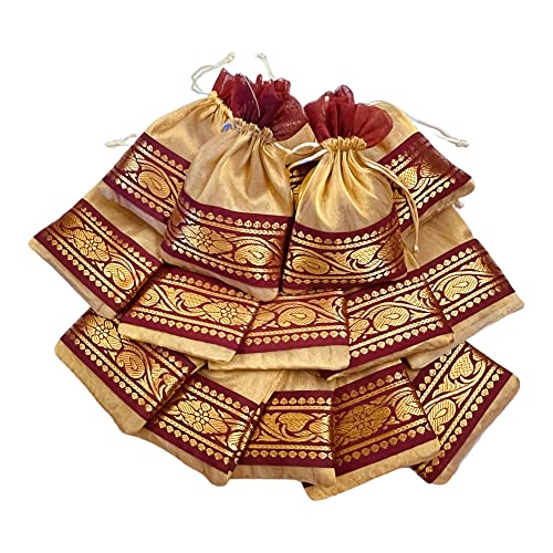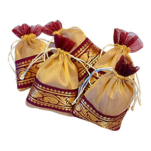 These bags are beautifully designed,Solid Golden Tissue with thick brocade border in Maroon contrast. These are simple yet elegant, simply pull the drawstring to secure contents. High quality beautiful and elegant Jewellery storage poches. These can be used as gift pouch potli bags. Designer premium potli bags are best for wedding, party supply, return gifts etc. Ethnic way to present for your gift. Very beautiful Potli bags you can use for multi purpose.