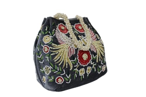 The potli shaped purse for her is a round, grey velvet handbag with a peacock feather design embroidered on the front in green, blue, yellow, and orange threads. It also has small pearls sewn around the embroidered design. The clasp closure is a gold colored metal frame with a decorative clasp in the center. The handle is a thin gold chain that connects to two rings on either side of the purse near the clasp. The embroidery appears to be floral and uses white, pink, and yellow thread. There are also a number of small pearls sewn onto the purse, especially around the embroidered flowers.