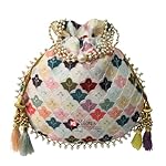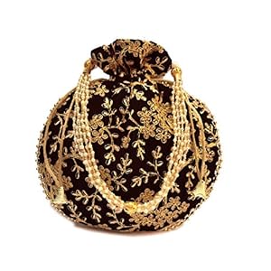 MILAN’S CREATION Fancy Potli Bag Golden Embroidery Designer Purse Drawstring Women’s handbag with Pearl Handle & Tassel Weddings