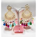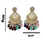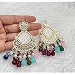 Introducing the latest arrival of exquisite multi colour earrings, a perfect blend of elegance and glamour. These stunning earrings feature a light gold plated design adorned with sparkling crystals, intricate kundan work, and lustrous pearls. Measuring approximately 9cm in length and 5cm in width (3.5 inches and 2 inches respectively), these earrings are a statement piece that will elevate any outfit. Suitable for every event and party, these earrings will enhance your look and give you a luxurious glam. Specially designed for girls and women, these earrings are a must-have accessory that will make you the centre of attention. With their vibrant colour and intricate craftsmanship, these earrings are sure to add a touch of sophistication and charm to your ensemble. Embrace the beauty of Indian craftsmanship and indulge in the timeless allure of these multi colour earrings.