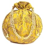 These Embroidered potli bags are made with Silk cloth with a tint of golden thread. Being lightweight, these can be wrapped around the wrist using the beautiful wrist handle. These wristlet potli bags come with a beautiful 4 string pearl handle and give you a glamorous look. Gift it to your favourite girl! Ideal for gifting, wedding return gift, mehendi function, Baby shower, festival or birthday return gift. This is enough to keep your accessories and all needed essentials and it can be a best gift for any woman. Material: Silk Size: 9×8.5 inches Color: Red, Yellow, Pista Green, Golden Please mention color of your choice.