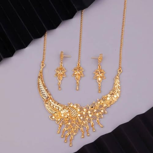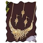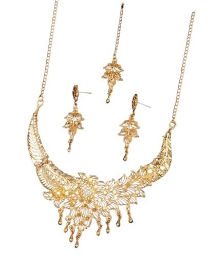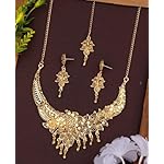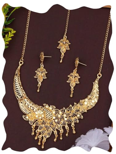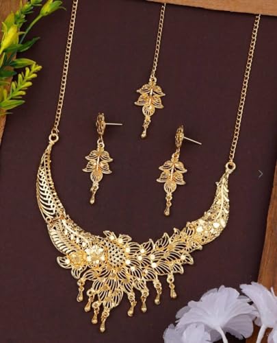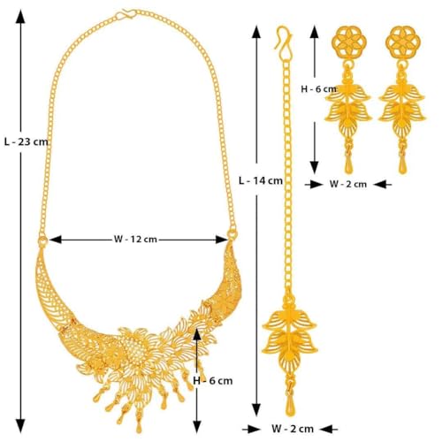 Elevate your style with our Gold-Plated Necklace Set, complete with Earrings and Maang Tikka, a stunning combination of traditional and contemporary elegance. This exquisite set is meticulously crafted to perfection, showcasing the rich cultural heritage of India. Ideal for weddings, festivals, and special occasions, this jewelry set adds a touch of sophistication and grandeur to any outfit. The centerpiece of this set is the gold-plated necklace, featuring intricate designs and adorned with classic motifs that reflect the timeless beauty of Indian craftsmanship. The matching earrings and Maang Tikka complement the necklace perfectly, creating a cohesive and elegant look. Made from high-quality materials, this jewelry set is designed for durability and long-lasting shine. The necklace sits gracefully around your neck, while the earrings and Maang Tikka add a regal touch to your ensemble. Lightweight and comfortable to wear, this set ensures you look and feel your best throughout any event. The intricate designs not only enhance your beauty but also hold cultural significance, symbolizing tradition and elegance. Whether you’re attending a wedding, celebrating a festival, or marking a special occasion, this Gold-Plated Necklace Set with Earrings and Maang Tikka is the perfect accessory to complete your look. It also makes a thoughtful and cherished gift for loved ones, embodying the beauty of tradition and modernity.