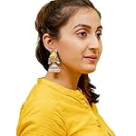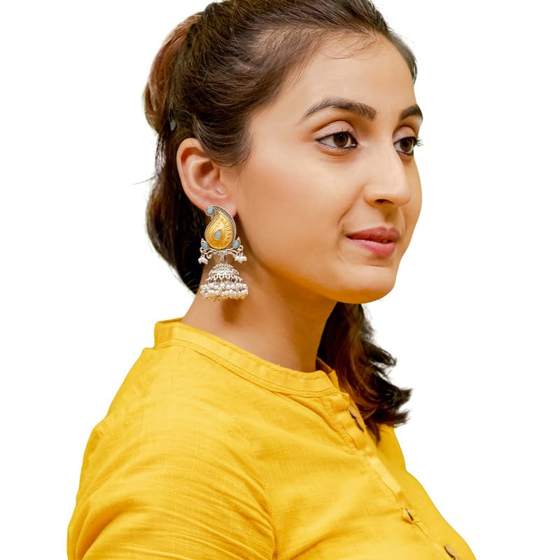 Two Tone Matte Gold Oxidized Silver Plated Medium sized Studded Paisley Jhumka Earring for women Intricate Handcrafted Paisley Jhumka Design All Over Classic, Evergreen And Long Lasting Design Earrings Jewellery is as per International Standards. Anti-Allergic and Safe for Skin Avoid of contact with water and organic chemicals i.e. perfume sprays. Avoid using velvet boxes, and store in air-tight boxes. After use, wipe the jewellery with soft cotton cloth. First wear your makeup, perfume – then wear your jewellery. This will keep your jewellery shining for years. Color – Black || Weight-30 gms || Length – 3.5 cm || Width – 1 cm Keeping ancient culture and Indian artisinal work alive and fashionable Ideal For All Festivals, Party, Weddings, Brides, Dulhan Navratri, Puja Sangeet And Religious Occassions