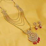 This sukkhi dazzling gold plated long haram necklace set for women is made of alloy. women love jewellery; specially jewellery adore a women. they wear it on different occasion. they have special importance on ring ceremony, wedding and festive time. they can also wear it on regular basis. make your moment memorable with this range. this jewellery features a unique one of a kind traditional embellish with antic finish.