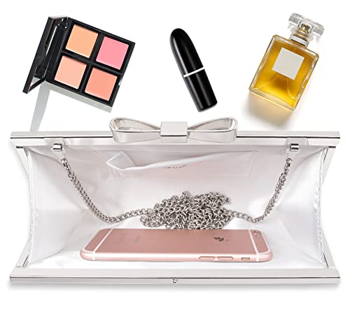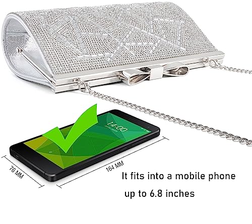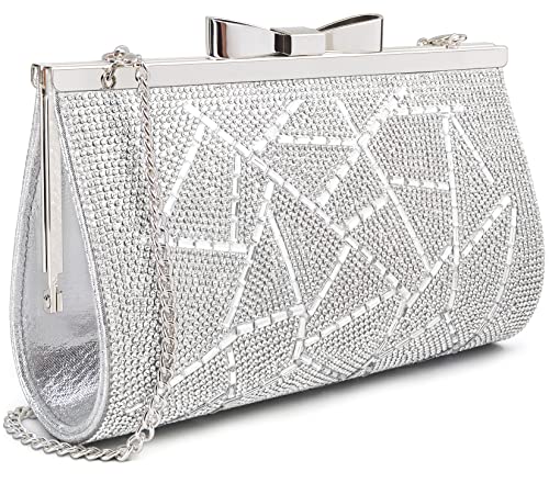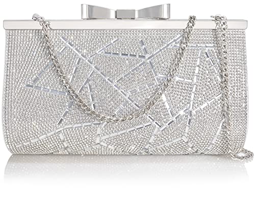 The glamorous evening clutch features allover sparkling crystals and bow metal frame.
