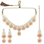 TANAIRA Baby Peach Color Stones Choker Necklace Earrings Maangtika Set For Women & Girls/Gold Color crystal Bridal Jewellery Set for Wedding |Women Anniversary Gift for Wife