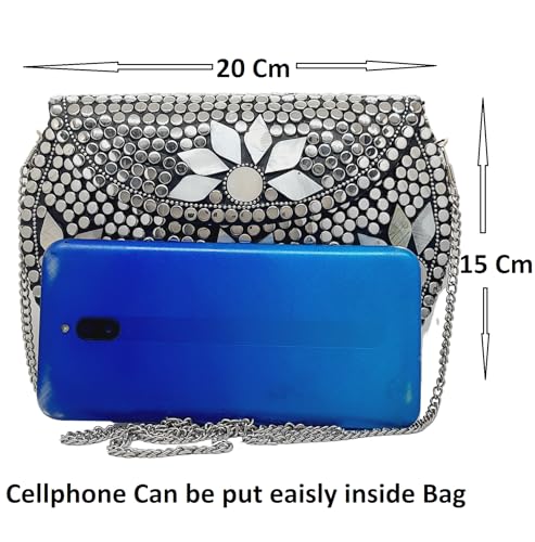 A beautiful gift of unique metal clutch purse from the Indian craftsmen. Beautiful White Flower made from MOP (Mother Of Pearl) and fine work of small silver round Brass beads in complete bag. The clutch is hand inlaid with small round beads made of golden brass metals. Such metal clutch bags is a very old art and but they are recently been introduced as a fashion statement. The wall of the inner space is also fixed with soft velvet to protect your items. Bag Feature:: “Length 7 Inch, Height 5.5 Inch and Chain length 19 Inch, Weight 390 Gm Clutch is spacious enough to fit your daily essentials, such as cellphone, lipstick, compact mirror, cards, cash, cosmetic, keys. Unique design evening bags are perfect for night out, date, cocktail party, family reunion, prom, banquet and so on . Stylish: Elegant, Bling madness, Glamorous, Fashionable.