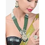 ZAVERI PEARLS Green Pink Meenakari Multistrand Beaded Long Kundan Necklace Earring & Ring Set For Women-ZPFK15624