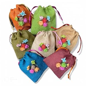 TheHandikrafts Unisex Colored Jute Potli With Multicolour Flower Jute Linen Potlis | 6 x 5 inches | Gift Bags for Return Gifts Bags| Jute Linen,Burlap